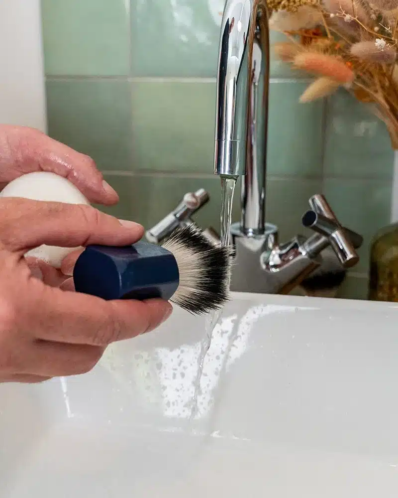 L’aventure commence par un geste simple mais essentiel : mouillez généreusement votre blaireau à barbe. L’eau est l’élément magique qui transforme le savon à barbe en une mousse riche et onctueuse. De quoi profiter d’un rasage tout en douceur.