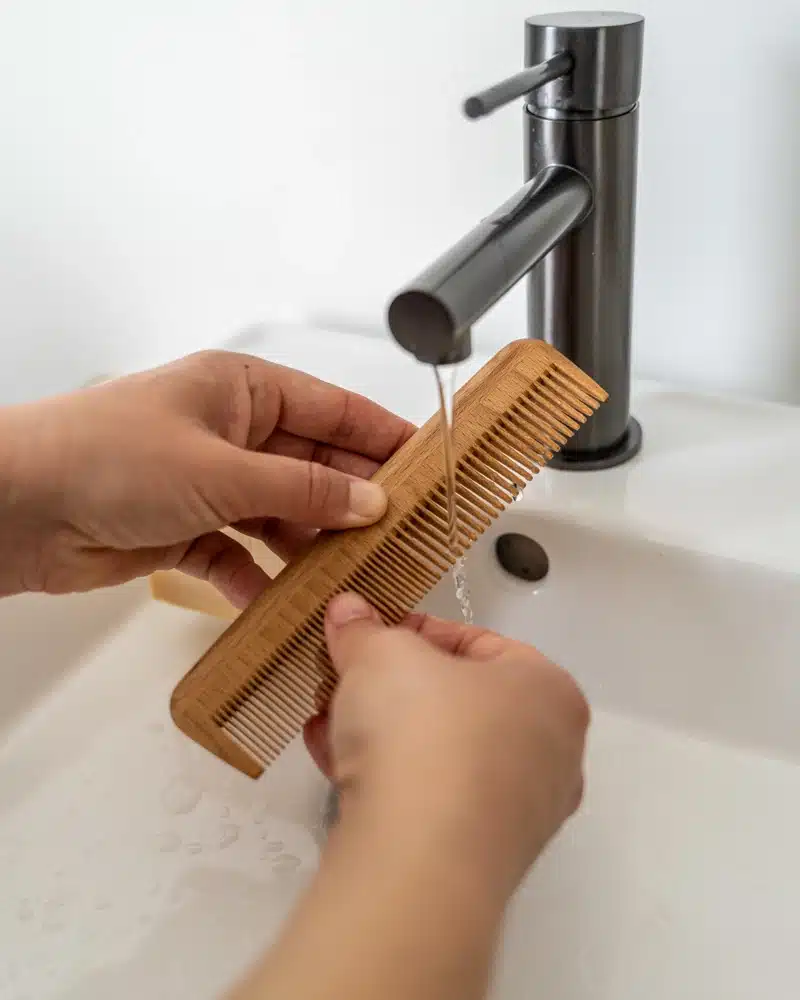 Frottez délicatement les dents larges et serrées du peigne avec un mélange d’eau tiède et de shampoing doux. Puis, assurez-vous de bien rincer le peignez pour éliminer les résidus.