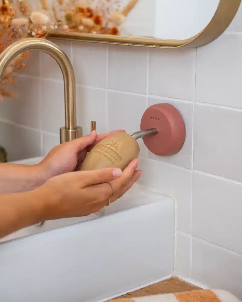 Car oui, de par sa conception, notre porte-savon rotatif est aussi pratique qu’hygiénique (qu’élégant, qu’écologique, que durable… bon ok on arrête là 😅). Il empêchera votre savon de glisser et l’aidera à sécher de façon optimal. Puis, on ne va se le cacher, mais avec le format généreux des savons écoliers, vous êtes tranquille pour un petit moment.